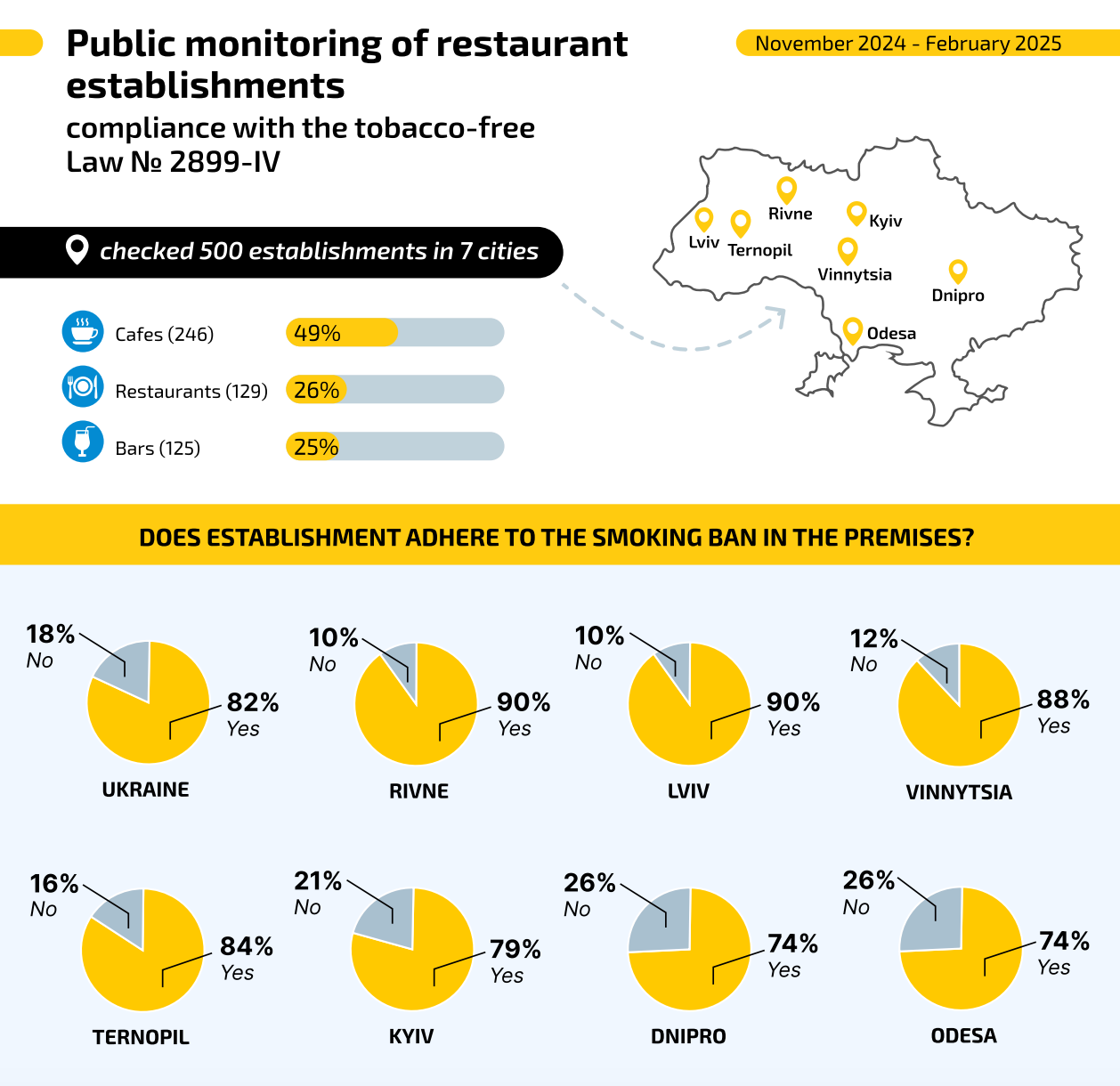 According to public monitoring data, in 2025, the vast majority (82%) of establishments in Ukraine complied with the ban on the smoking of all tobacco and nicotine products indoors[51].